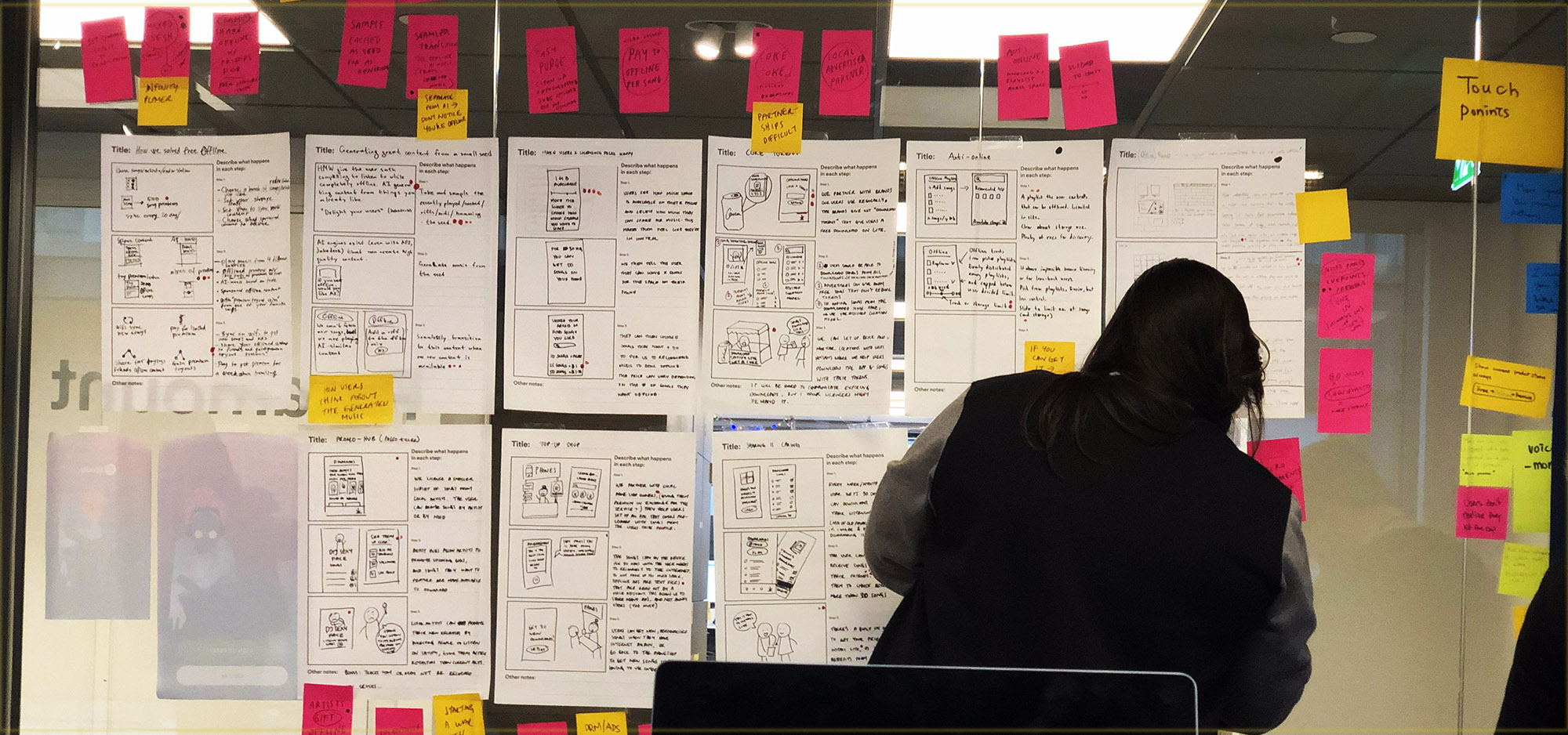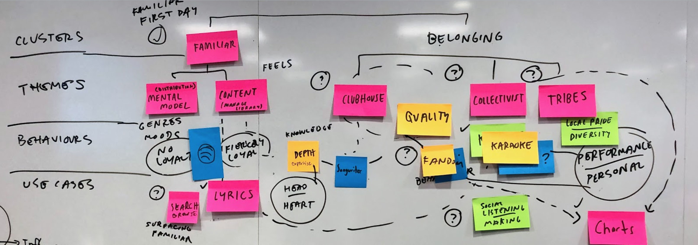 At this stage, we were focused on translating key observations and opportunities into actionable solutions. First, the team members engaged in a process of brainstorming to generate ideas about how to address the issues and opportunities identified in the user research. We then created a concept map through which we developed a shared understanding of the main ideas and organized the complex notions in a visual manner. People have a wide variety of intentions when they connect to music; as such, we recognized the need to develop various solutions that fulfilled different user needs. Throughout the process, we acknowledged that there were no bad ideas. Ideas to do good could be be considered, even if it did seem somewhat outside the box.