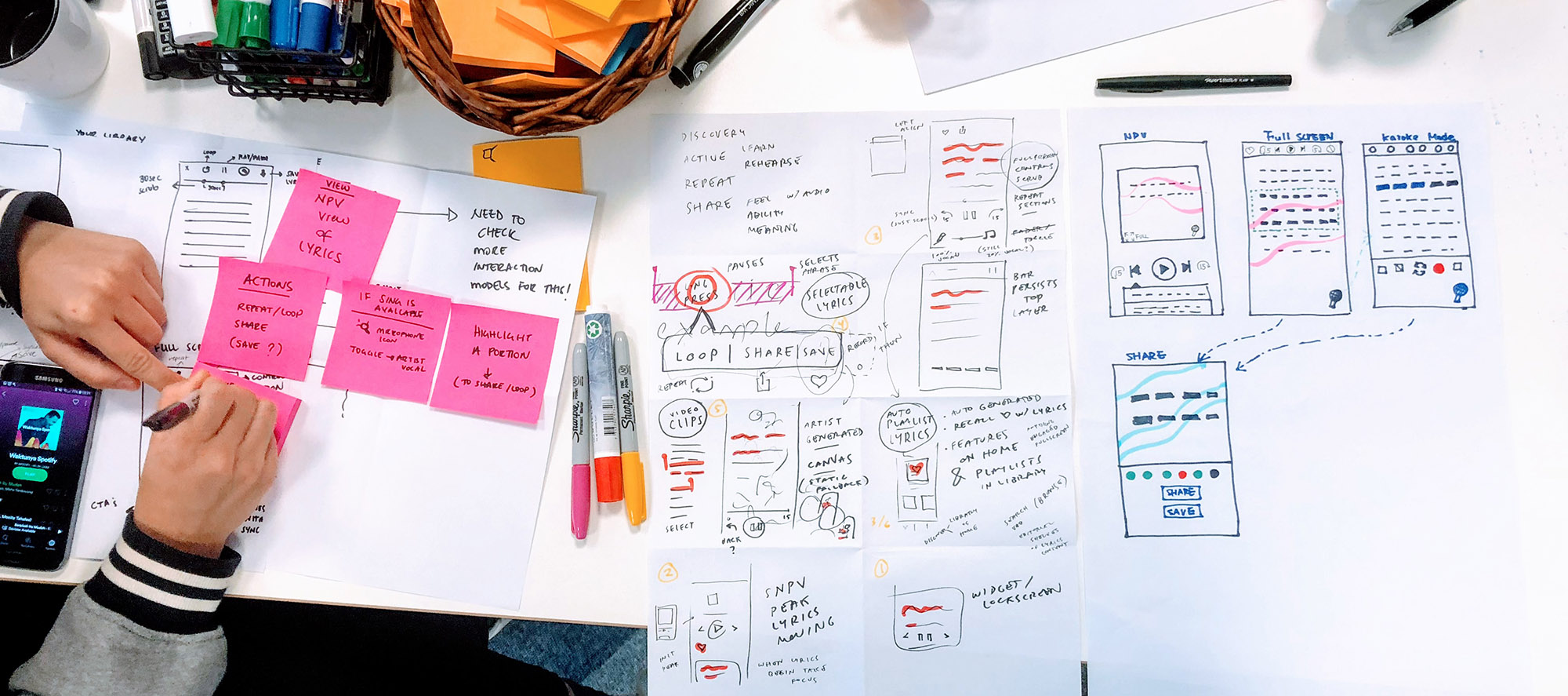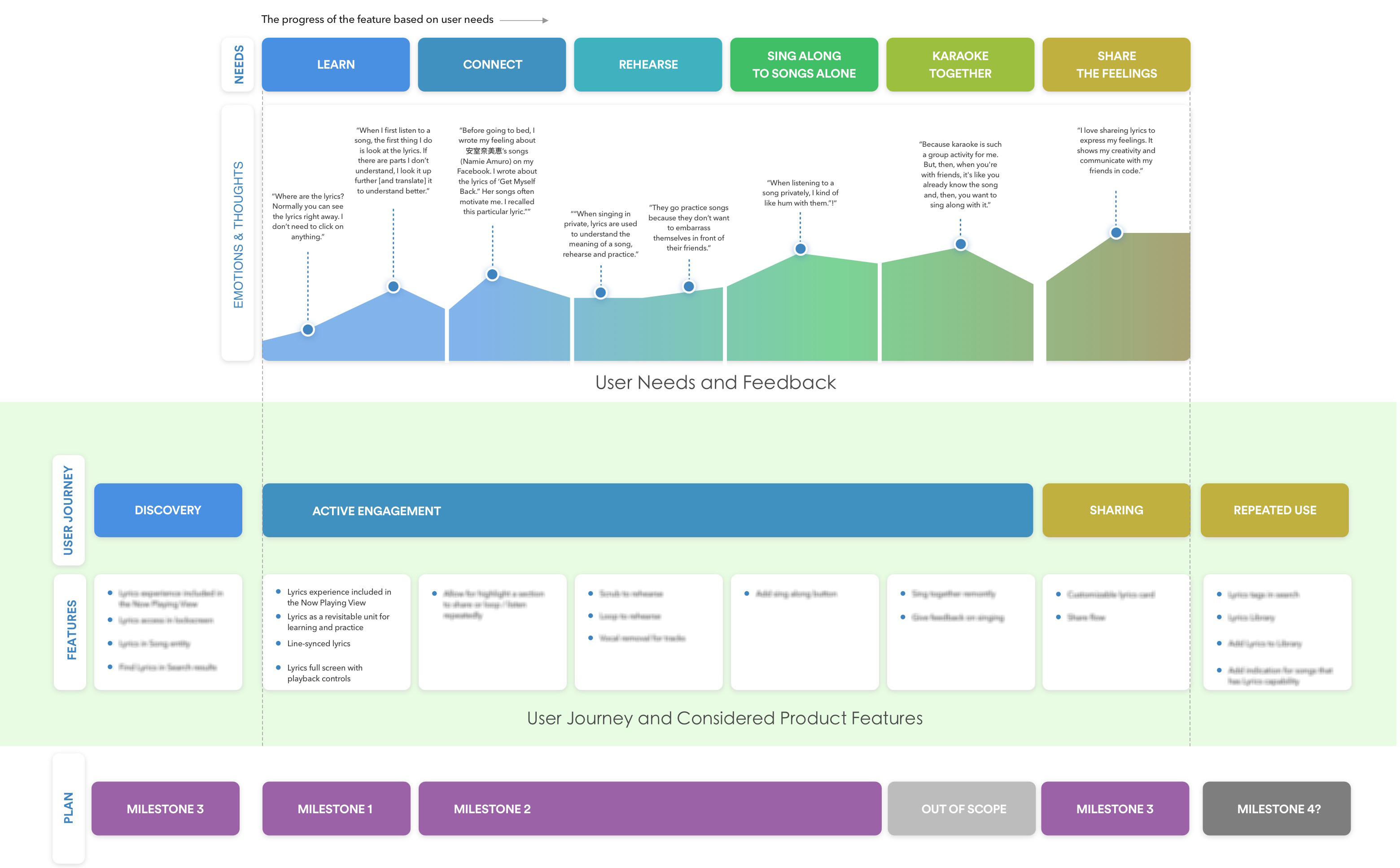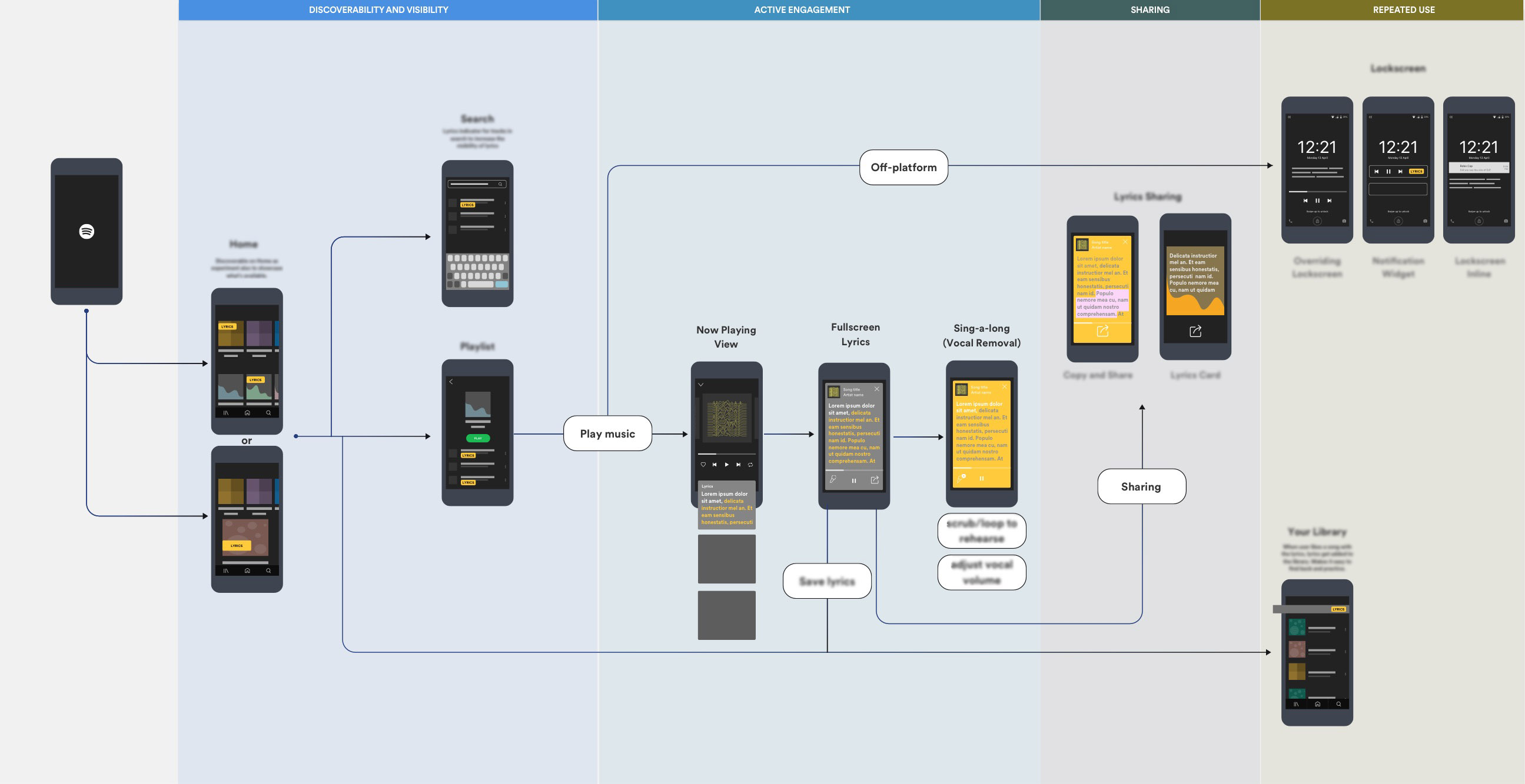 Having sketched out the concepts, we continue to verify the design using prototypes with varying degrees of fidelity. Once the final design solution is validated through testing, we create high-fidelity assets and work closely with software developers to achieve our goal. We also started the design work for the next milestones, which include improving the discoverability of lyrics and the possible sharing flow.